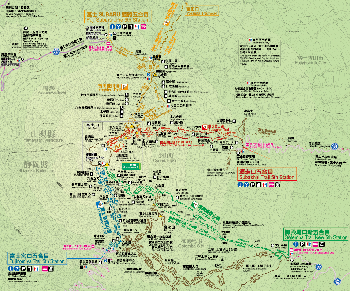 富士山有四條登山路線,按顏色區分,登山口是在五合目附近。